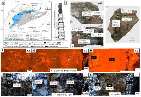 英国365网站(武汉)365英国上市公司石油地质系平宏伟教授团队联合刘晓峰教授、澳大利亚麦考瑞大学Simon George教授等,针对湖北宜昌秭归九龙湾剖面盖帽白云岩中碳同位素极端负偏的方解石胶结物的成因进行深入研究,取得了重要进展。相关成果以《Thermogenic methane release after Marinoan glaciation induced extremely 13C-depleted calcite precipitation in cap dolostones》为题,发表于国际著名期刊《Geology》上。